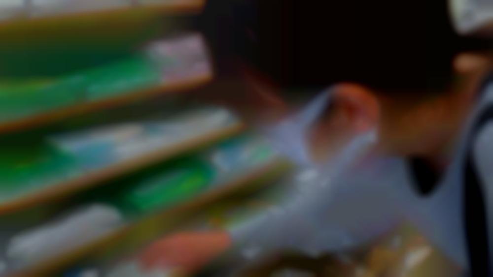 低い位置の商品を見るために大きく前屈み。