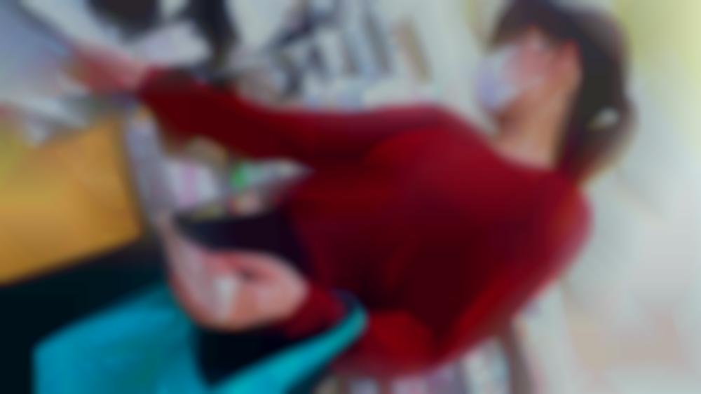 赤いニットの胸元には程よいゆとりがありそうで屈んでくれればチャンスありですね。