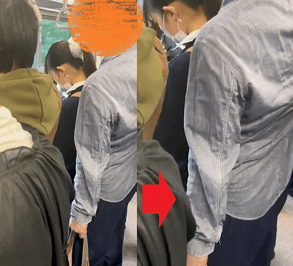それなりの人混ですが肩と肩を寄せ合うほどではないはずですが女性の背後にぴったり密着しています。