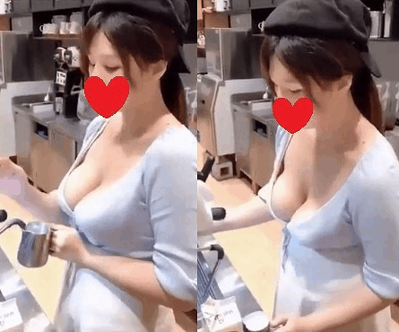 可愛らしい店員さんの服はなんと胸元ざっくり。しかもかなりの巨乳さんです。