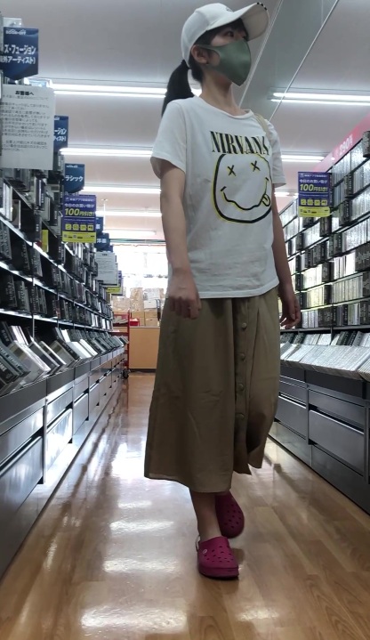 本屋にてニルヴァーナTシャツを着込んだお姉さん。