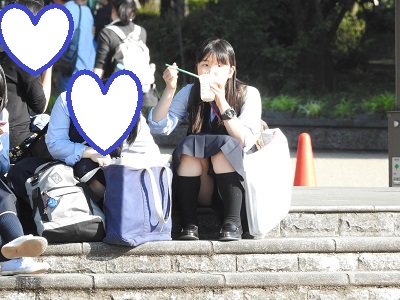 石椅子に座ってお弁当を食べている左の制服姿のコが、黒パンチラ?見せパン?だったり、石段に友達といっしょに