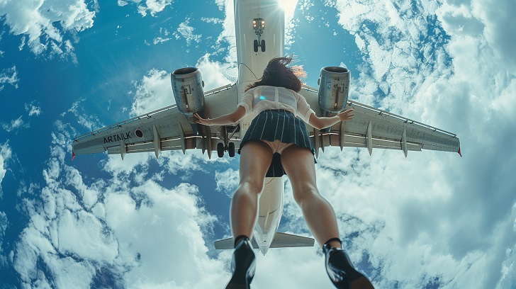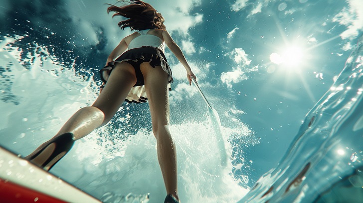 キャビンアテンダントたちが制服着用したままマリンスポーツを楽しむ姿を画像生成AIが描いたAI写真のスライドム