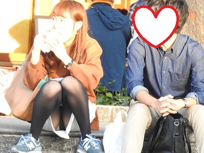 石段に座っている綺麗なお姉さんがM字になり、パンスト越しの白のパンティーを見せていたり、石椅子に座ってい